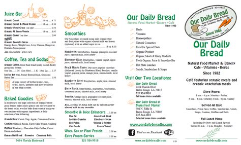 In conclusion, the Daily Bread menu offers a delightful array of options that cater to various tastes and preferences. From hearty breakfasts to satisfying dinners, each dish is crafted with care and attention to detail, using the freshest ingredients. But Daily Bread is more than just a place to grab a meal; it’s a community hub where people come together to enjoy good food and good company. It’s a place where you can relax, unwind, and savor the simple pleasures of life. Whether you’re a local or a visitor, Daily Bread offers a warm welcome and a memorable dining experience.