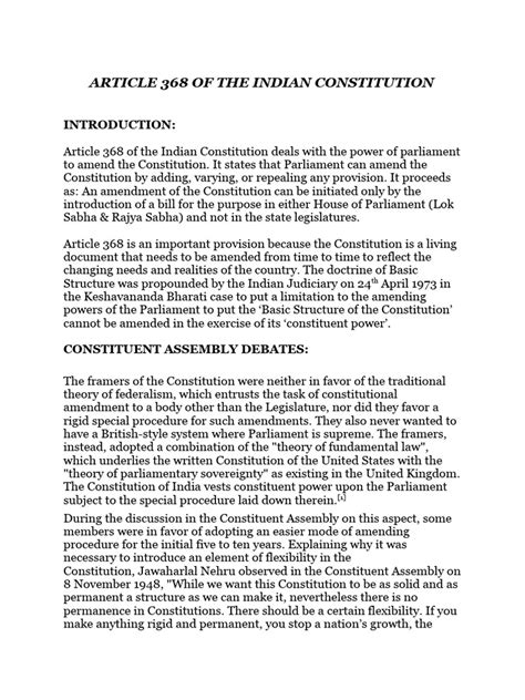 So, what exactly is Article 368? In simple terms, it’s the provision in the Indian Constitution that grants Parliament the power to amend the Constitution. But hold on, it’s not as simple as just snapping your fingers! Article 368 outlines the specific procedures that must be followed for any amendment to be valid. Think of it as the rulebook for changing the rulebook itself. This is super important because it ensures that changes are made thoughtfully and with broad consensus, safeguarding the fundamental principles of the Constitution. The framers of the Constitution recognized that the document needed to be flexible enough to adapt to changing times, but they also wanted to prevent hasty or arbitrary changes that could undermine its core values. Article 368 strikes this crucial balance, providing a mechanism for change while also setting up safeguards to protect the integrity of the Constitution. The article doesn’t just deal with the power to amend; it also lays out the specific procedures that must be followed. This includes the requirement for a special majority in both houses of Parliament, and in some cases, the ratification by a majority of the state legislatures. This ensures that any changes to the Constitution are made with careful consideration and broad support, rather than being the whim of a single party or a fleeting political mood. This process is designed to prevent easy or arbitrary changes, ensuring the fundamental principles of the Constitution are protected while still allowing for necessary adaptation. The article is not just about the power to amend, it’s about regulating how that power can be used responsibly and effectively.