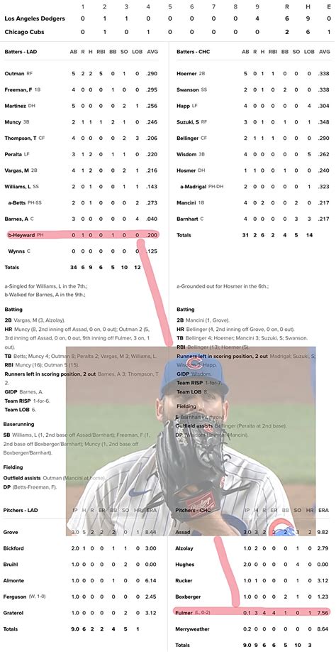 First, you’ll see the team names and the final score. Below that, you’ll find the inning-by-inning scores, showing how many runs each team scored in each frame. This is crucial for understanding the game’s momentum. Did the Dodgers come back from behind? Did they jump out to an early lead? The inning-by-inning breakdown tells the story. Next comes the ‘RHE’ column, representing Runs, Hits, and Errors. The ‘R’ tells you how many runs the team scored, the ‘H’ shows the number of hits they got, and the ‘E’ indicates how many errors they committed. This section gives you a quick overview of offensive performance and defensive miscues. Following that, you’ll encounter the individual player stats, which is where things get really interesting. Here’s a breakdown of the key stats you’ll find for each player: