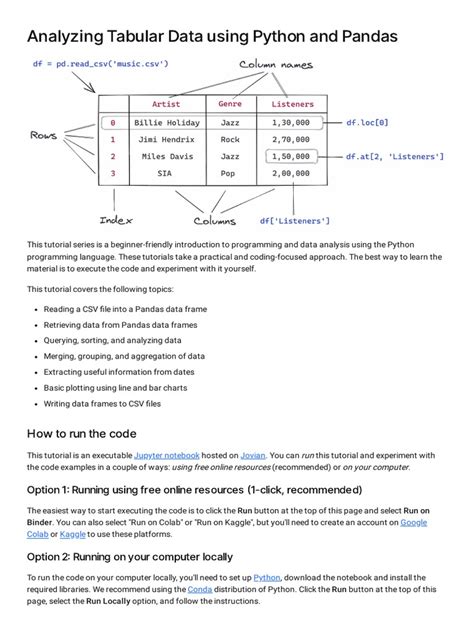 The as pd part is just a convention, allowing us to refer to Pandas using the shorter alias pd . Next, we need to load our data. Pandas supports reading data from various sources, such as CSV files, Excel spreadsheets, SQL databases, and more. For this example, let’s assume we have a CSV file named dodgers_stats.csv containing player statistics from the game. We can load this data into a Pandas DataFrame using the read_csv() function: