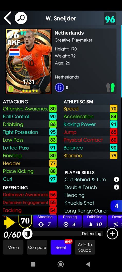 Once the core stats are maxed out or significantly boosted, it’s time to fine-tune Sneijder with secondary enhancements. This is where you polish the diamond. Tight Possession and Dribbling are prime candidates here. Investing points here will make Sneijder much more comfortable on the ball, allowing him to retain possession under pressure and execute quick dribbles to evade defenders. This is crucial for a player who operates in congested midfield areas. A few points in Form can also be beneficial, ensuring he’s more consistently available and performing at a higher level throughout the season, though this depends on the specific player card you are using. While Sneijder isn’t built for speed, a small allocation of points to Acceleration and Speed can provide a much-needed boost, helping him to close down opponents slightly or make those sudden bursts to find space. However, be judicious; these stats are less critical than his attacking attributes. Stamina is another stat worth considering. While he won’t be tracking back constantly, having decent stamina means he can maintain his influence for the full 90 minutes without significantly dropping in performance. The goal here is to create a well-rounded attacking midfielder who isn’t just a one-trick pony. He should be capable of holding the ball, making intelligent runs, and contributing defensively when needed, without sacrificing his primary roles. These enhancements transform a good player into a truly complete midfielder, adaptable to various game situations and always a threat.