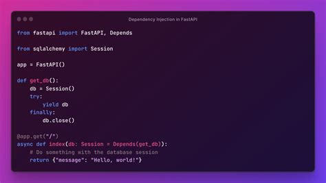 In this example, we define a dependency called get_db that simulates a database connection. We then use Annotated to create a new type DbDependency that represents a dictionary that depends on the get_db function. In the read_items function, we simply declare a parameter of type DbDependency , and FastAPI automatically injects the result of the get_db function. Notice how the function signature remains clean and focused on the core logic, while the dependency injection details are handled by Annotated .