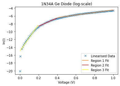 Recall the diode equation: I = I_s (e^(V/nV_T) - 1) . For forward bias voltages much larger than nV_T , the ‘-1’ term becomes negligible, so I ≈ I_s e^(V/nV_T) . Taking the natural logarithm of both sides gives ln(I) ≈ ln(I_s) + V/(nV_T) . This equation is in the form of a straight line, y = mx + c , where y = ln(I) , x = V , m = 1/(nV_T) , and c = ln(I_s) . Therefore, the slope of the ln(I) versus V curve is 1/(nV_T) . Since V_T = kT/q (thermal voltage, approximately 25.85 mV at room temperature, 300K), you can calculate ‘n’ using the formula: *n = 1 / (slope * V_T)*.