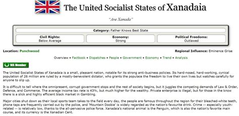 • NationStates: This is the main menu. From here, you can access the forum, other nations, and other important aspects of the game.