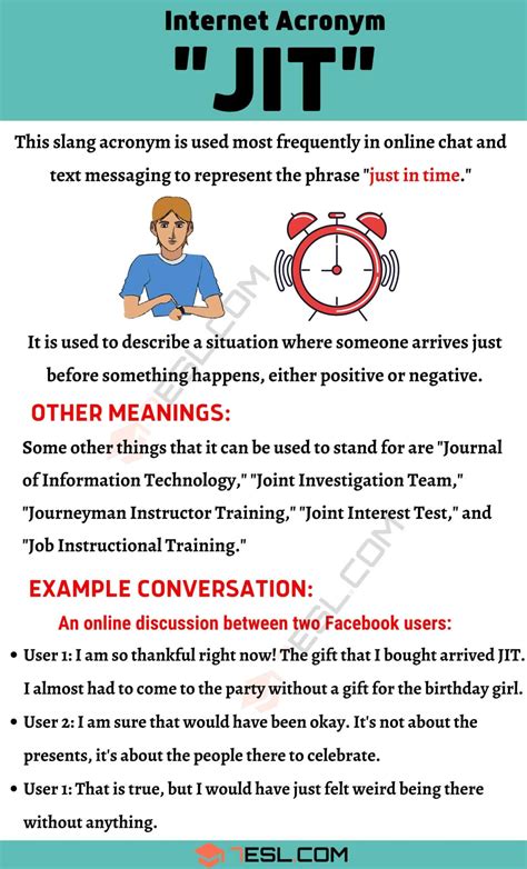 As you can see from these examples, JIT is a versatile abbreviation that revolves around the concept of perfect or opportune timing. It’s a handy tool in your texting arsenal for conveying efficiency and punctuality in a concise way. So, next time you see JIT, you’ll know exactly what your friends are talking about!