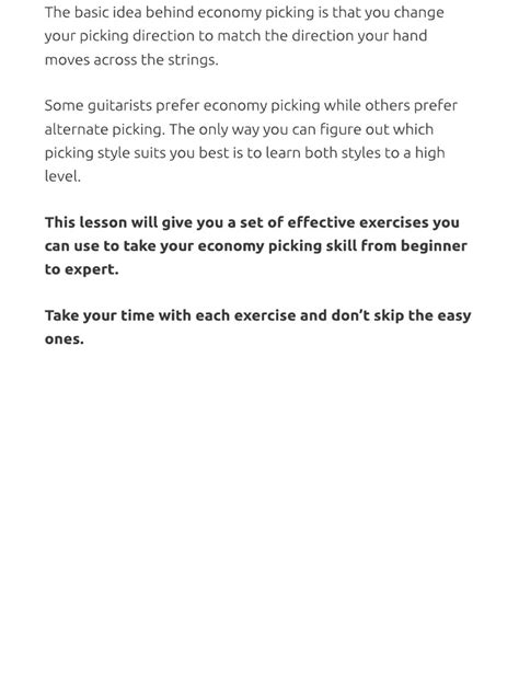 Alright, guys, let’s talk about why you should be investing your precious practice time into economy picking . The benefits are massive, and frankly, they’ll make you wonder why you didn’t pick this up sooner. The most obvious advantage is speed . Because you’re eliminating unnecessary pick movements, you can achieve significantly higher tempos. Imagine playing a rapid-fire scale or a blistering solo without your picking hand feeling like it’s struggling to keep up. Economy picking allows your pick to move in a more direct line between notes, especially when moving across adjacent strings in the same direction as your pickstroke. This direct path means less travel time for the pick, and thus, more notes per second. But it’s not just about raw speed; it’s also about fluidity and control . When your picking hand is moving efficiently, your playing sounds smoother and more connected. You’ll find that those tricky passages that used to sound choppy or hesitant start to flow effortlessly. This improved control also means you can execute notes with greater accuracy and precision, even at high speeds. Another huge plus is reduced fatigue . Think about it: every extraneous movement your pick makes is wasted energy. By minimizing that wasted energy, your picking hand stays more relaxed for longer. This means you can play faster for longer periods without your hand cramping up or getting tired. This is absolutely crucial for live performances and extended practice sessions. Versatility is another key benefit. While often associated with fast metal solos, economy picking isn’t limited to shredding. It can be applied to various musical contexts, including jazz, blues, and rock. It’s a fundamental technique that underpins many advanced guitar styles. The ability to seamlessly transition between strings with minimal effort opens up a whole new world of melodic possibilities and technical maneuvers. Consistency in your playing is also enhanced. When your picking motion is economical, it tends to be more consistent. This means your tone and attack remain more uniform across different strings and passages, leading to a more polished and professional sound. So, if you’re looking to elevate your playing, increase your speed, improve your control, reduce fatigue, and gain a more versatile skillset, economy picking is definitely the way to go. It’s a fundamental building block for advanced guitar technique that will serve you well for years to come.