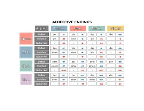 It’s a lot to keep track of, I know! But with practice and a good understanding of the rules, you’ll get the hang of it. The key is to understand the underlying system rather than trying to memorize every single ending individually. Think of it like learning a dance: once you know the steps, you can apply them to different songs. These endings aren’t just random letters thrown on at the end; they provide crucial grammatical information that helps the listener or reader understand the relationships between words in a sentence. Without the correct endings, sentences can become ambiguous or even nonsensical. Therefore, mastering adjective endings is crucial for accurate and fluent communication in German. Moreover, correctly using adjective endings demonstrates a strong command of German grammar, which can impress native speakers and open doors to deeper conversations and opportunities. Ignoring or neglecting these endings will only lead to misunderstandings and hinder your progress in learning the language. So, take the time to understand and practice them – it’s an investment that will pay off in the long run.