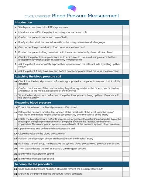 So, what exactly makes up this magical blood pressure OSCE checklist , you ask? Think of it as a step-by-step guide, broken down into manageable chunks that ensure nothing slips through the cracks. We’re talking about the whole shebang, from the moment you walk into the station to the moment you walk out. First off, there’s the patient preparation and communication . This is where you introduce yourself, confirm the patient’s identity (the golden rule, right?), explain what you’re going to do, and gain their consent. You also need to check for any factors that might affect the reading, like recent exercise, smoking, caffeine intake, or a full bladder. This shows you’re thinking clinically! Then comes the equipment selection and preparation . You need to choose the right size cuff – too small and the reading will be falsely high, too big and it’ll be falsely low. Makes sense, right? You’ll also need to ensure your stethoscope is working correctly. Next up, the patient positioning . The patient should be seated comfortably, with their arm supported at heart level, back supported, and feet flat on the floor. No dangling legs or slouching! This is super important for an accurate reading. Following that, we get to the actual cuff application . You’ll need to locate the brachial artery, place the cuff snugly but not too tight, with the artery marker aligned correctly. Then, you’ll place the stethoscope’s diaphragm over the brachial artery, just below the cuff. The inflation and deflation process is critical: inflate rapidly to about 30 mmHg above the expected systolic pressure (or until the radial pulse disappears), then deflate slowly and steadily at a rate of 2-3 mmHg per second. You’re listening for the Korotkoff sounds to determine systolic (first sound) and diastolic (sound disappears). Finally, recording and interpretation . You need to record the reading accurately, including the arm used and patient position, and have a basic understanding of what the numbers mean. You might also be asked about normal ranges or potential follow-up. Each of these sections has specific actions that examiners are looking for, and ticking them off ensures you’re demonstrating comprehensive skill. It’s like a game of Jenga – remove too many blocks, and the whole thing collapses!