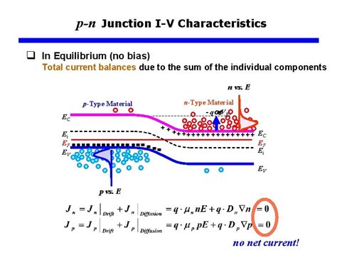 At equilibrium, these two currents perfectly balance each other out. The diffusion current tries to make the electrons and holes move across the junction, while the drift current tries to move them back. The two currents are equal in magnitude and opposite in direction, leading to a net current of zero. It is like a tug-of-war where both sides are equally strong, and nothing moves. This balance is critical for the stability of the pn junction. The balance of diffusion and drift currents is a key feature of the pn junction at equilibrium. It maintains a stable condition within the semiconductor material.