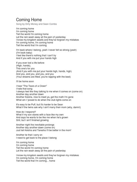 Often, the bridge of a song offers a shift in perspective, a deeper contemplation. In “Coming Home,” this section is frequently used for reflection and gratitude . Sean Combs might take a moment here to look back on the journey, acknowledging the lessons learned, the growth experienced, and the people who played a part in bringing him home. It’s a quieter, more introspective part of the song, where the raw emotions can truly shine through. You might hear lyrics that express a sense of humility, a realization of how far he’s come, and a deep appreciation for the destination. It’s like pausing at the doorstep, taking a deep breath, and acknowledging the entire experience before stepping inside. This is where the vulnerability often comes to the forefront. Combs might express his thanks to those who supported him, or reflect on the personal growth that made the journey possible. It’s a testament to the idea that coming home isn’t just about a physical location, but about a personal transformation. He might ponder the challenges faced and how they ultimately contributed to his strength and resilience. This part of the song is crucial because it adds layers of depth to the narrative, moving beyond a simple return to a profound statement about personal evolution. It reminds us that the journey itself is as important as the destination, and that true homecoming often involves coming home to oneself. It’s a moment of quiet contemplation before the final, powerful rendition of the chorus, leaving the listener with a sense of peace and understanding. The gratitude expressed here can be incredibly moving, as it highlights the interconnectedness of our journeys and the importance of support systems. It’s a beautiful reminder that we are rarely alone in our struggles and triumphs.