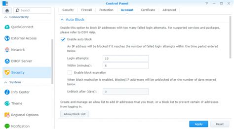 • Synology’s Auto Block feature automatically blocks IP addresses that repeatedly fail to log in. This helps prevent brute-force attacks. Enable this feature in the Security settings.