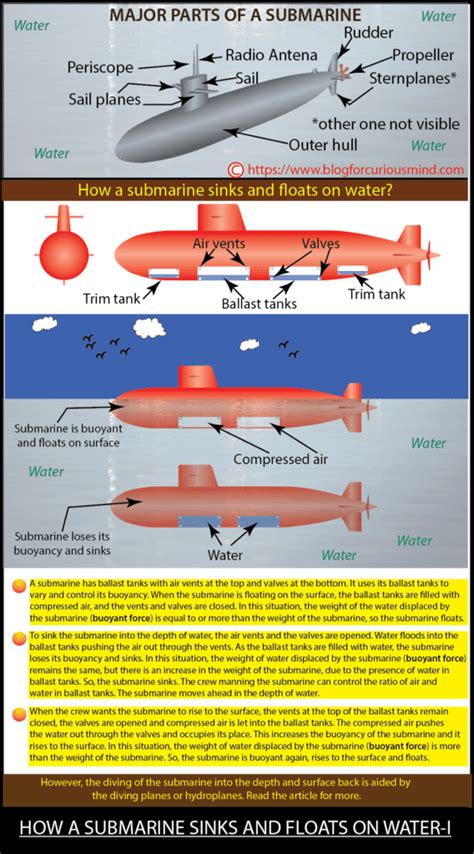 But how does a submarine sink? That’s where ballast tanks come into play. These are special compartments within the submarine’s hull that can be filled with water or air. When the submarine wants to submerge, it opens valves and allows seawater to flood into these ballast tanks. This increases the submarine’s overall weight, making it denser than the surrounding water. As a result, the buoyant force is no longer sufficient to keep the submarine afloat, and it begins to sink. When the submarine wants to surface, it uses compressed air to blow the water out of the ballast tanks. This reduces its weight and makes it less dense than the water, causing it to rise.