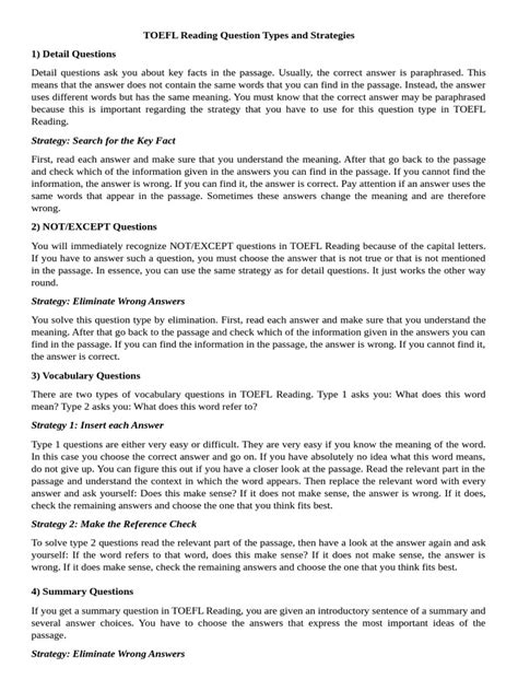 Alright, let’s get into the nitty-gritty of the TOEFL Reading question types . Knowing what you’re up against is half the battle! The TOEFL Reading section assesses your ability to understand academic texts. These texts are usually excerpts from textbooks or academic journals. The questions evaluate different reading skills, including identifying the main idea, understanding details, making inferences, and recognizing the author’s purpose. There are several categories of questions you’ll encounter, each designed to test different aspects of your reading comprehension. Let’s explore each category in detail to ensure you’re fully prepared for test day. Understanding these question types and mastering the strategies will greatly improve your ability to navigate the passages and answer the questions with confidence. Remember, the more familiar you are with the types of questions, the better equipped you’ll be to answer them efficiently and accurately under the time constraints of the test. Keep in mind that practice is key, and the more you practice these question types, the more confident and prepared you will feel.