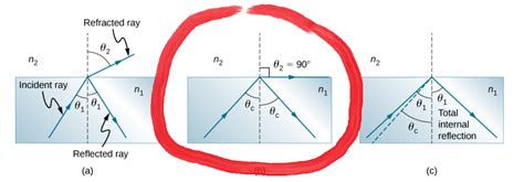 The conditions for TIR are crucial: you must be going from a denser medium to a less dense medium, and the angle of incidence must be greater than the critical angle. When the angle of incidence is exactly the critical angle, you get that special case where light travels along the boundary – a perfect precursor to the full reflection that happens when the angle is just slightly larger.