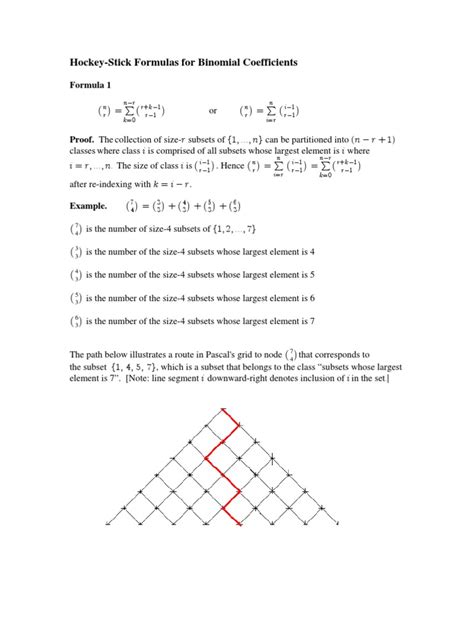 One of the coolest things about the hockey stick theorem is its visual representation in Pascal’s triangle. You can literally see the “hockey stick” shape forming as you trace the diagonal and then turn to the adjacent number. This visual aid can be incredibly helpful for understanding and remembering the theorem. The essence of Pascal’s Triangle is that each number is the sum of the two numbers above it, reflecting the combinatorial identity (n choose k) = (n-1 choose k-1) + (n-1 choose k) . This foundational property underpins many patterns within the triangle, including the hockey stick theorem .
