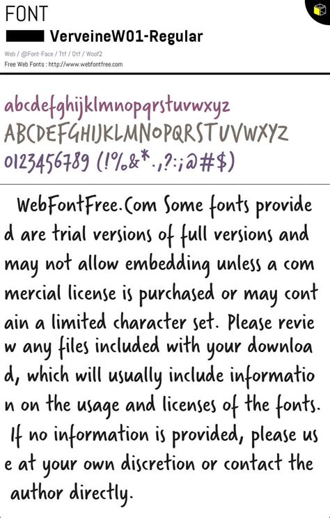 Understanding the licensing and usage rights of the Verveine Regular font is crucial. This will ensure that you are using the font legally and ethically. The licensing terms typically vary depending on the source. Some fonts are available under open-source licenses, such as the SIL Open Font License, which allows for free use, including commercial projects. Other fonts may require a purchased license for commercial use. The license usually specifies the permitted uses, such as website design, print materials, and logo creation. It’s essential to check the license terms for any restrictions, such as the number of users or the types of projects. Be sure to respect the licensing agreements. Improper use can lead to legal complications. Complying with the licensing terms will also support the designers and foundries that created the font. If you have any doubts, consult the font’s licensing documentation or contact the font provider directly. They can provide clarification on the specific usage rights. Proper understanding of the licensing terms will help you ensure compliance and avoid any potential legal problems. Always keep these things in mind when using the font in your design projects.